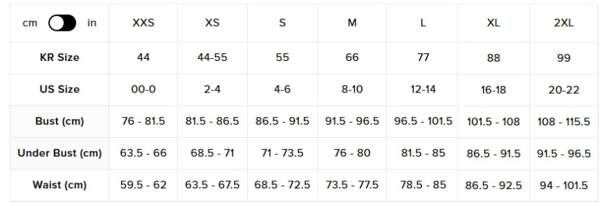 - XXS, XS, S: 약 25 1/8인치